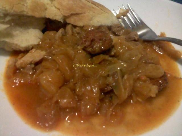 Meso iseći na komade veličine zalogaja. Na zagrejanoj masti propržiti crni luk dok ne omekša. Dodati meso i pržito dok ne porumeni. Posoliti i pobiberiti po ukusu, a zatim smanjiti vatru i dodati kim, lovorov list, alevu papriku i seckani beli luk. Sipati 250 ml vode i ostaviti da provri, a zatim poklopiti i na tihoj vatri kuvati sat i po vremena. Posle tog vremena dodati sitno seckani kiseli kupus i paradajz pire. Po potrebi još malo začiniti. Sipati vrelu vodu toliko da ogrezne kupus u šerpi, a zatim uključiti rernu i zagrejati je na 250 C. Kada se zagreje, šerpu staviti u rernu i krčkati još jedan sat. Gotov gulaš servirati uz kiselu pavlaku.