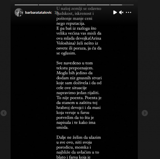 "Sve navedeno u tom tekstu prepoznajem. Mogla bih jedino da dodam niz gnusnih stvari koje sam doživela iz cele ove situacije i da od cele ove situacije napravimo jedan rijaliti. To nije poenta. Poenta je da stanem u zaštitu toj hrabroj devojci i da masi koja veruje u farsu potvrdim da to šta je napisala i te kako ima smisla".