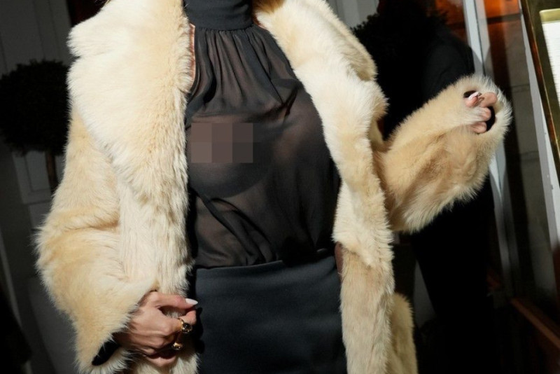 Nosila je skroz providnu crnu majicu te jasno pokazala grudi, a iskombinovala ju je sa prekratkom crnom suknjicom i dugačkom bundom od svetlog krzna.