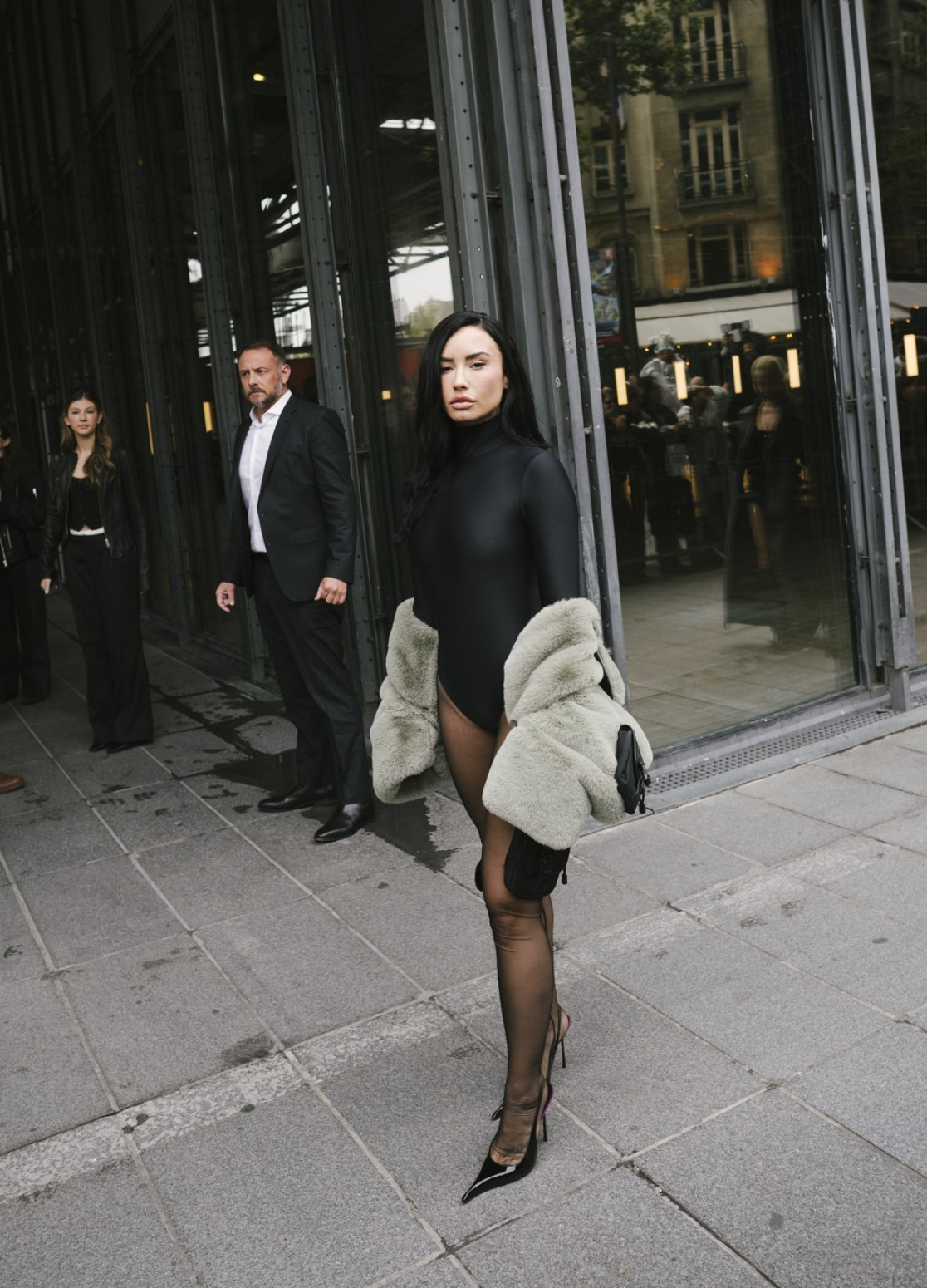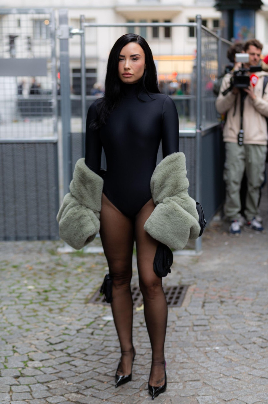 Za ovu priliku je odlučila da ponese crni bodi koji je naglasio njenu vidno mršavu figuru, a stajlingu je dodala visoke potpetice, kao i maslinasto zeleni ogrtač koji je "razbio" ovo monohromatsko izdanje.