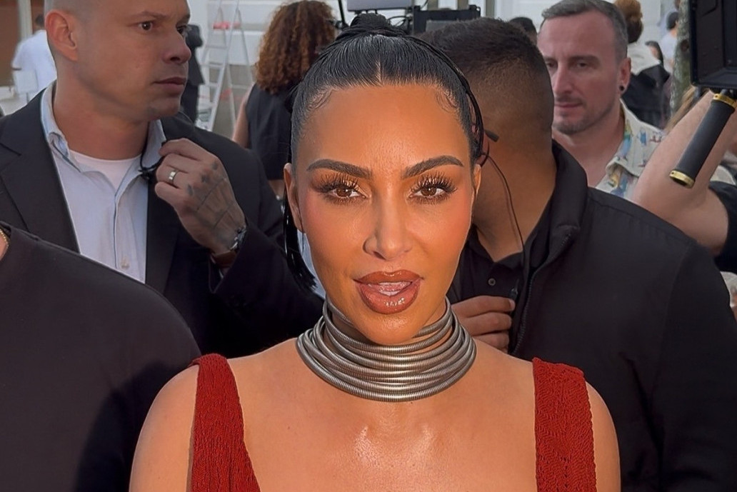 Kardašijanka je odabrala crvenu ležernu haljinu koja lagano pada preko grudi i zamalo otkriva previše. Kao i obično, Kim je sve ukrasila detaljima, pa je oko vrata imala niz srebrnih ogrlica nalik na popularne čokere, dok je kosu zalizala i pokupila u punđu.